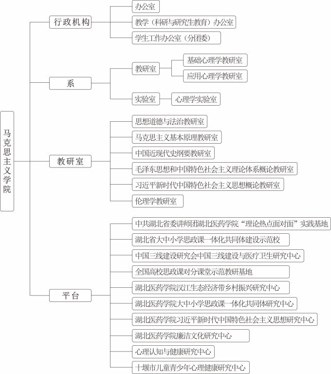 目前下设3个科级机构(办公室、教学科研与研究生教育办公室、学生工作办公室),1个系(应用心理学系)、8个教研室(思想道德与法治、马克思主义基本原理、中国近现代史纲要、毛泽东思想和中国特色社会主义理论体系概论、习近平新时代中国特色社会主义思想概论、伦理学、基础心理学、应用心理学)、1个实验室(心理学实验室)。