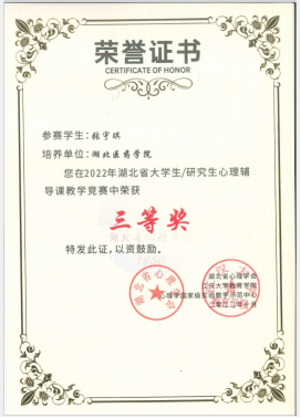 本网讯(通讯员 柴晓运)近日,人文社会科学学院应用心理学系收到湖北省大学生/研究生中小学心理健康课教学大赛组委会寄来的证书,我校选拔的2020级欧阳瑞婷、张宇琪和张柴青等三位同学均喜获三等奖。