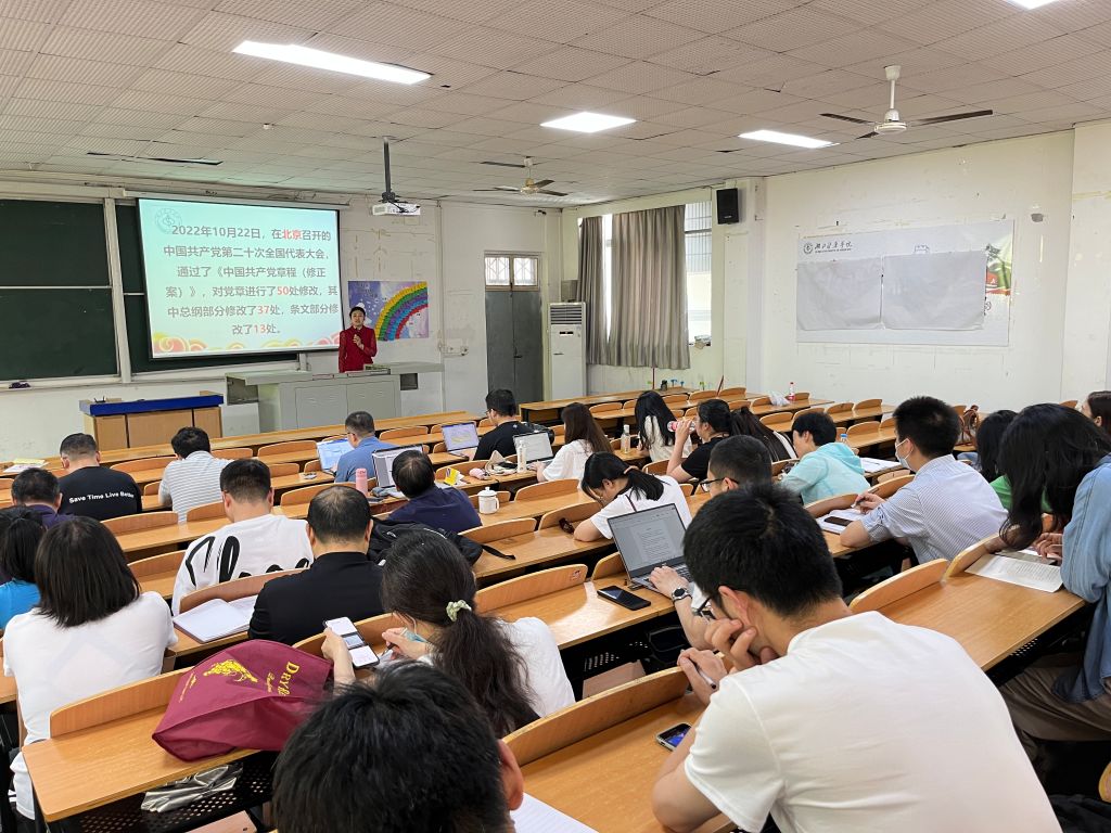 第二讲由思政课部汤玉红老师以党的二十大党章修改的重点内容及其重大深远历史意义为主题,以《中国共产党章程》历次修改的过程为引,通过对党章修订部分及重大深远历史意义逐一进行细致的分析和解读,引导全体党员深刻领悟和准确把握党章的新部署新要求。