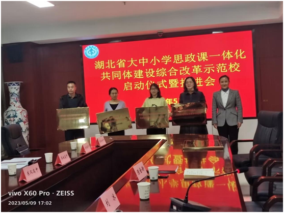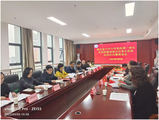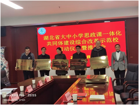 本网讯(通讯员 魏晨 陈全新)5月9日下午,我校举办了湖北省大中小学思政课一体化共同体建设示范校启动仪式暨推进会。校党委常委、统战部长谭艳、2138cn太阳集团班子成员、教学办、全体思政课教师、10个理事会成员单位负责人及骨干教师等共60多人参加了本次会议。会议由2138cn太阳集团刘冰院长主持。