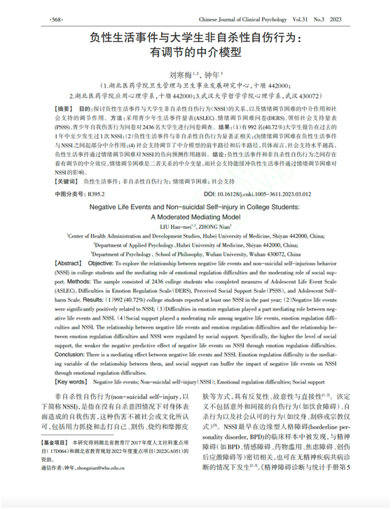 本网讯(通讯员 朱明一)太阳集团2138人文社会科学学院应用心理学系一直关注大学生的心理健康素养研究。近日,刘寒梅老师的科研成果“负性生活事件与大学生非自杀性自伤:一个有调节的中介模型”发表在《中国临床心理学杂志》(CSSCI)。该文主要探讨了负性生活事件与大学生非自杀性自伤的关系及其情绪调节困难和社会支持在其中的作用机制。