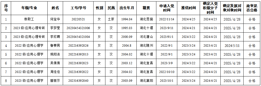 经党支部培养教育和考察,在听取入党介绍人意见和政审的基础上,学院第二党支部于2025年6月12日召开党员大会表决,拟同意接收何宝华等8名同志为预备党员,并报学院党委审批。根据发展党员工作有关要求,现对拟接收预备党员的基本情况予以公示: