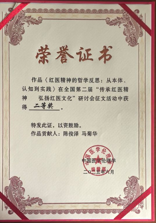 本网讯(通讯员 肖飞)6月28日至29日,由《中国医学伦理学》杂志主办、哈尔滨医科大学承办的第二届全国“传承红医精神 弘扬红医文化”研讨会在哈尔滨医科大学成功召开。本次研讨会聚焦红医精神的深刻内涵与时代价值,旨在推动红医文化资源的整合以及红医育人体系的构建,吸引了众多专家学者与研究生参与。经过三轮论文盲评,我院马菊华、邵蕾蕾、孔祥清三名老师合作的《从红医到廉医的双螺旋价值解码——基于德性伦理学视角》获得一等奖、陈俊泽、马菊华老师的《红医精神的哲学反思:从本体、认知到实践》获得二等奖的好成绩,马菊华老师受邀作主旨报告。