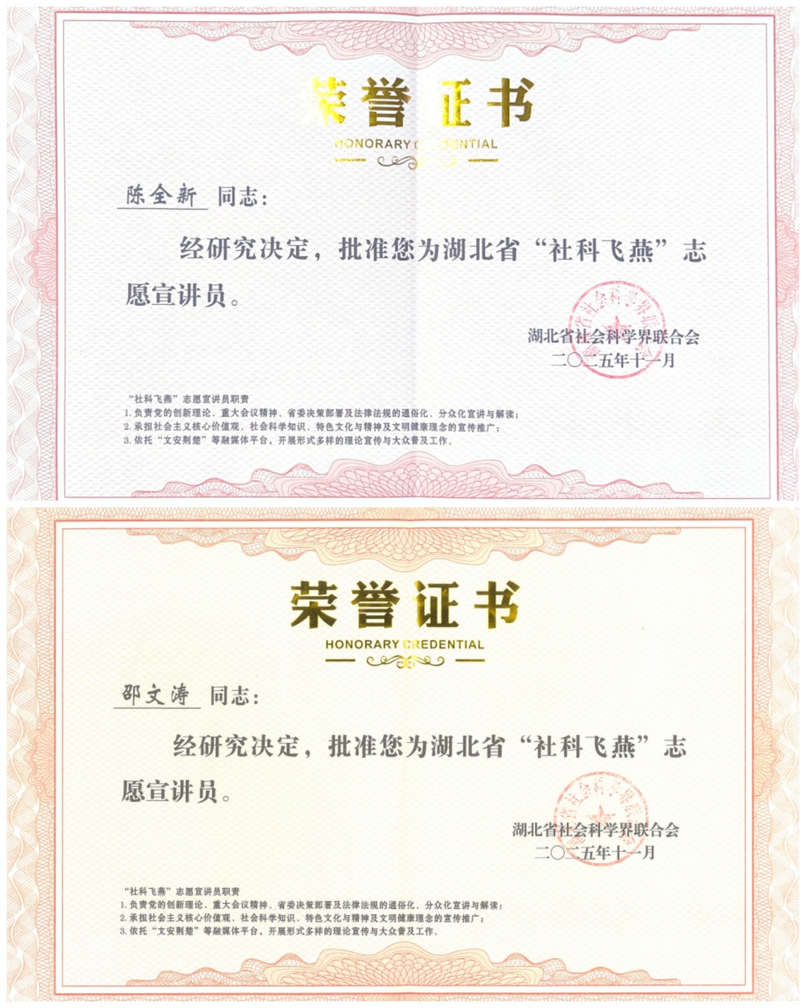 本网讯(通讯员 彭惜芹)近日,湖北省社会科学界联合会公布了湖北省“社科飞燕”志愿宣讲员名单,我校2138cn太阳集团陈全新及校图书馆邵文涛同志被聘为湖北省志愿宣讲员。