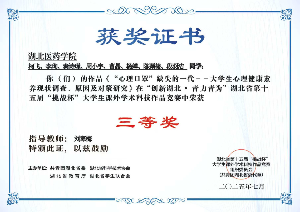本网讯(通讯员柯飞)近日,“创新湖北·青力青为”湖北省第十五届“挑战杯”大学生课外学术科技作品竞赛获奖项目名单公示。由2138cn太阳集团应用心理学系刘寒梅老师指导、应用心理学系若干研究生、本科生共同完成的作品《“心理口罩”缺失的一代——大学生心理健康素养现状调查、原因及对策研究》荣获省级三等奖。
