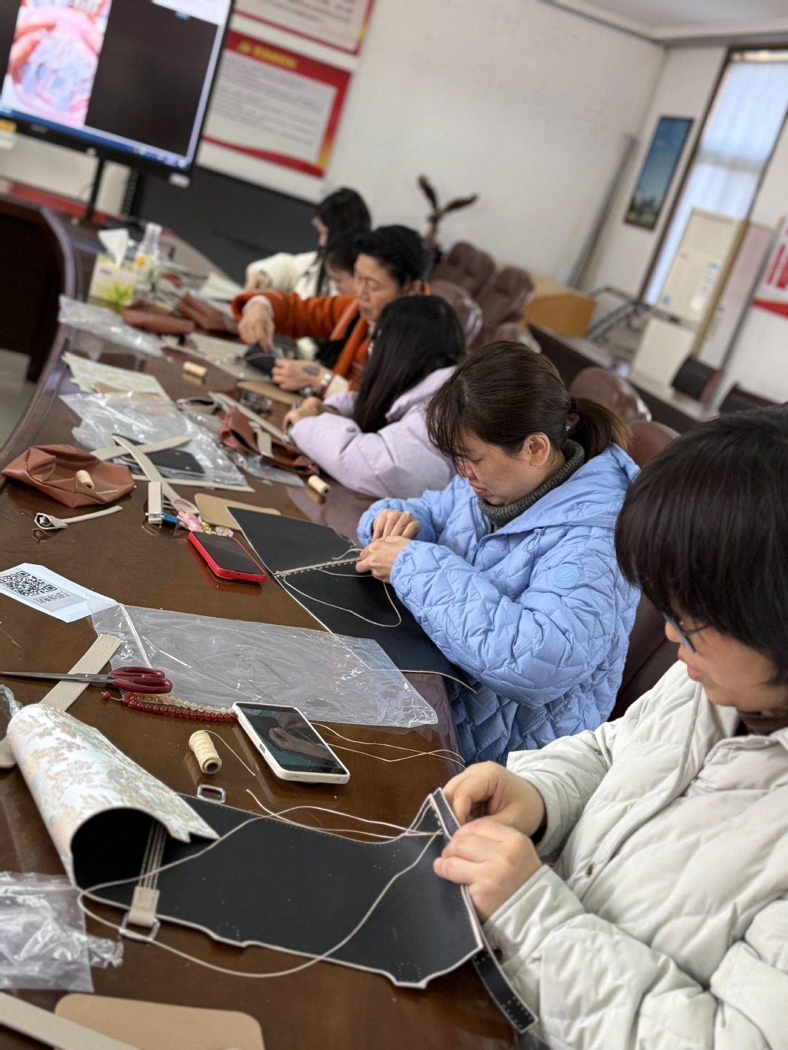 活动现场氛围温馨热烈,老师们兴致盎然、热情参与。在工作人员的细致讲解与指导下,大家沉浸式体验传统手工艺魅力。制作国风水桶包时,大家精心搭配面料、注意走针细节,将东方美学与创意巧思相融,兼具实用与美感;制作非遗宋锦珍珠扇时,老师们凝神细作、穿珠饰扇,让宋锦的典雅与珍珠的温润相得益彰,尽显非遗技艺之精妙。大家时不时相互交流、彼此协助,在轻松愉悦的氛围里舒缓工作压力、增进情感交流,一件件精致雅致、独具匠心的作品次第呈现,充分展现出马院女教职工知性优雅、热爱生活、积极向上的精神风貌。
