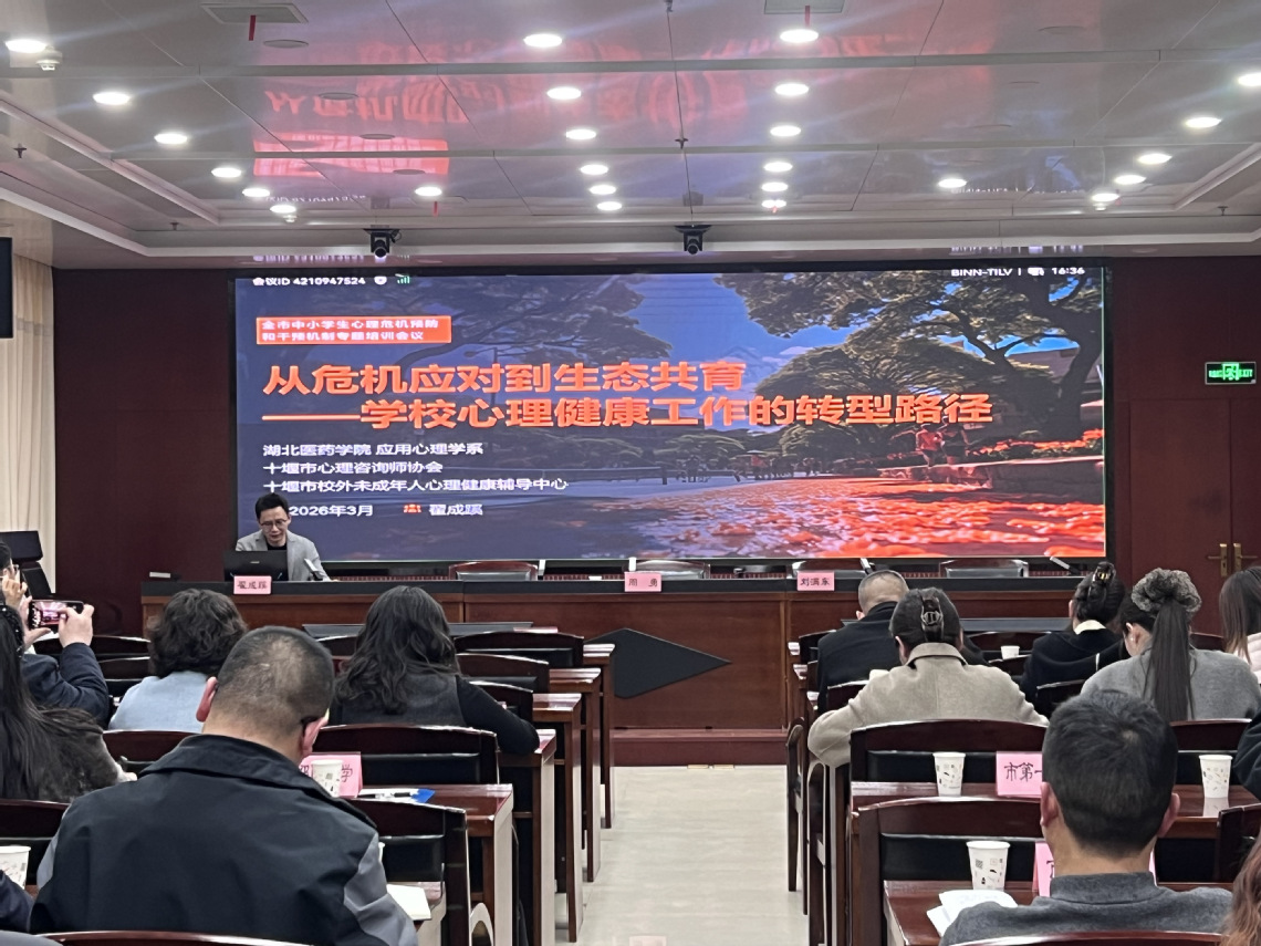 本网讯(通讯员 黄欣为进一步健全全市中小学生心理危机预防和干预机制,提升心理健康教育工作的系统性与实效性,2026320日下午,十堰市教育局以线上+线下形式组织召开全市中小学生心理危机预防和干预机制专题培训会议。2138cn太阳集团应用心理学系副教授、心理学博士翟成蹊受邀担任主讲专家并作专题授课。