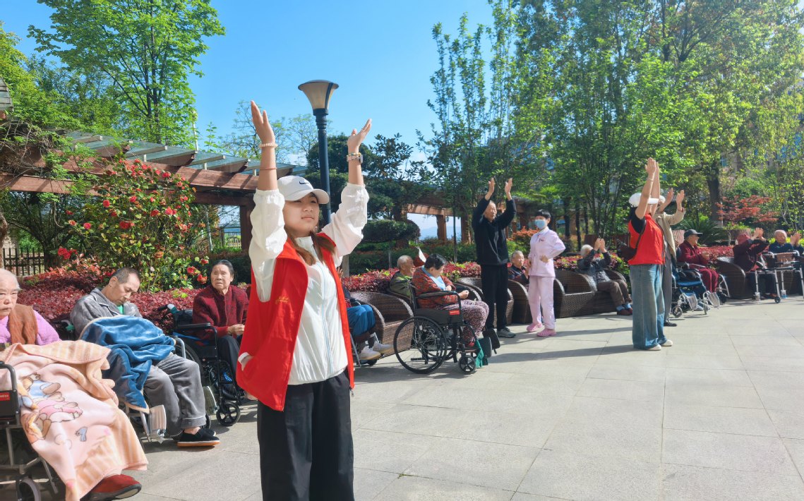 活动现场暖意融融,志愿者们结合老年人的身体特点,精心设计了多个互动环节。活动伊始,志愿者们带领老人们开展“怀旧律动操”,围绕颈部放松、肩部舒展、扩胸伸展、腰部轻转等舒缓动作,耐心指导老人们活动筋骨、舒缓身心。起初略显生疏的老人们,在志愿者的细致引导下逐渐跟上节奏,抬手、转身、伸展,动作虽缓却充满活力,现场氛围轻松而温馨。随后,趣味手势舞环节将活动气氛推向高潮。志愿者们选取《春天的祝福》、《红山果》等旋律轻快、传唱度高的经典曲目,与老人们围坐成圈,手把手地教授手势动作。老人们学习热情高涨,眼神专注、认真模仿,不时与身边的志愿者和同伴交流互动,部分学得较快的老人还主动担当“小老师”,帮助身边同伴纠正动作,欢声笑语回荡在养老中心的每个角落,定格下一幕幕温馨瞬间。
